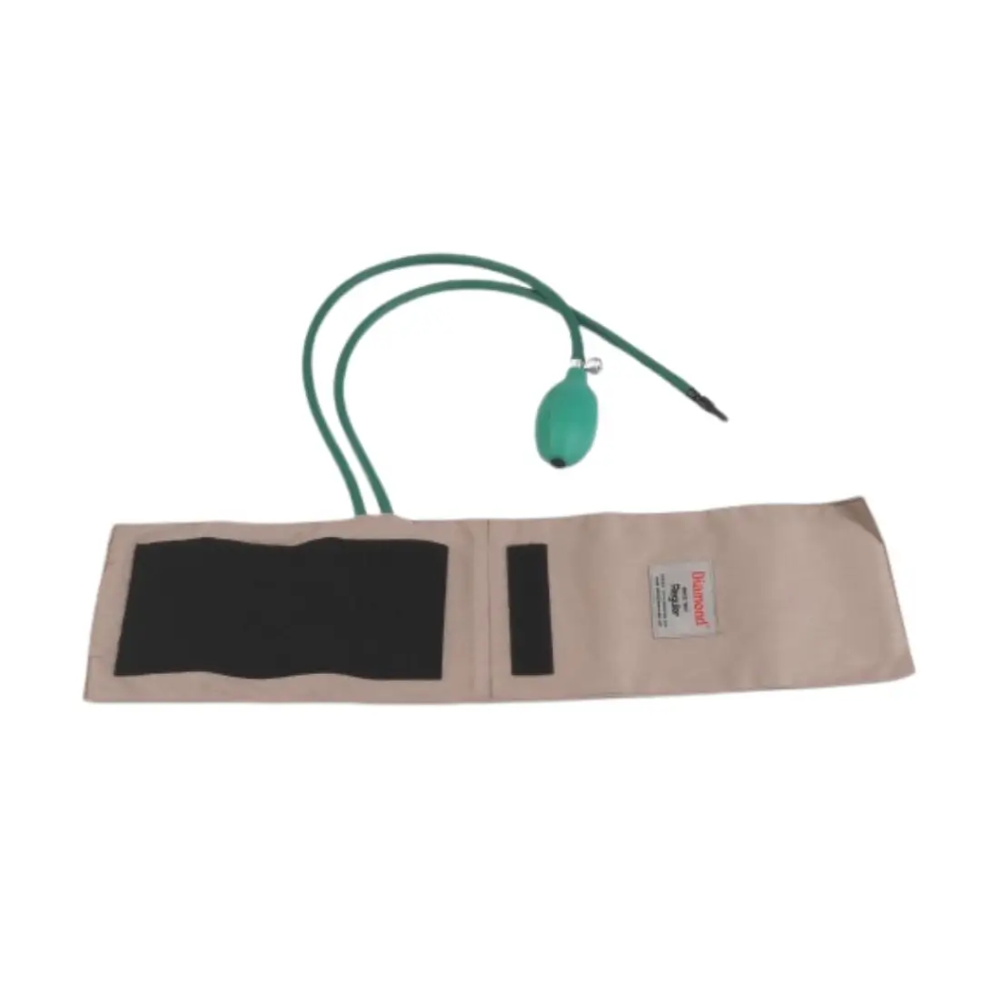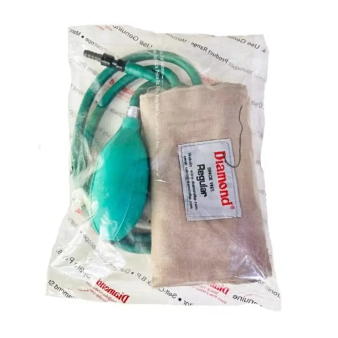 Diamond B.P. Cuff Set for Mercury B.P. Monitor is a complete accessory kit that includes a regular cloth bag, bladder, bulb, control valve, connector pair, all essential components for accurate blood pressure measurement.