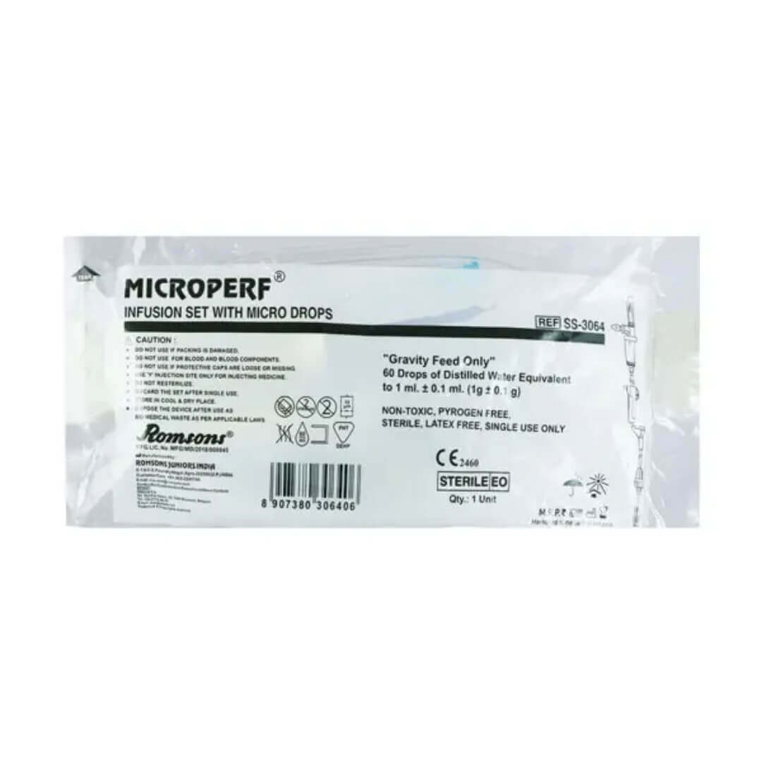 Romsons Microperf Infusion Set is a medical device used for accurate and controlled fluid administration, making it ideal for pediatric and critical care therapy. It comes with a micro drip size of 60 drops per ml, ensures precise fluid regulation, reducing the risk of over-infusion.