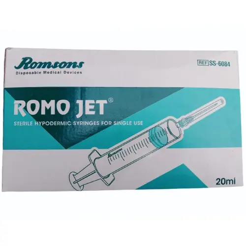 The Romsons Romo Jet 20ml Syringe with Needle is a high-quality, sterile, single-use syringe designed for precise medication administration, fluid aspiration, and medical procedures. It comes with a pre-attached, sharp, high-precision needle for smooth injections and minimal patient discomfort.