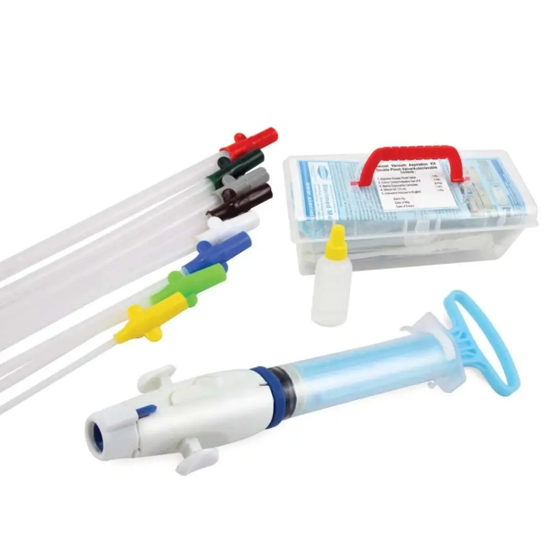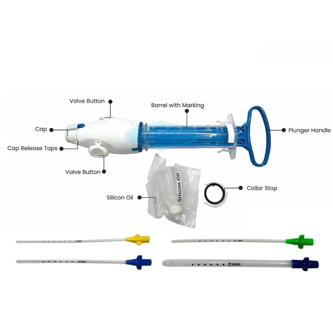 The Manual Vacuum Aspiration Kit is made from high-quality medical-grade polypropylene. The kit consists of an MTP Syringe, which offers a strong vacuum suction during the abortion process, and Karman Cannulawith with rounded tips and smooth eyes for atraumatic cannulation and lubricating oil.