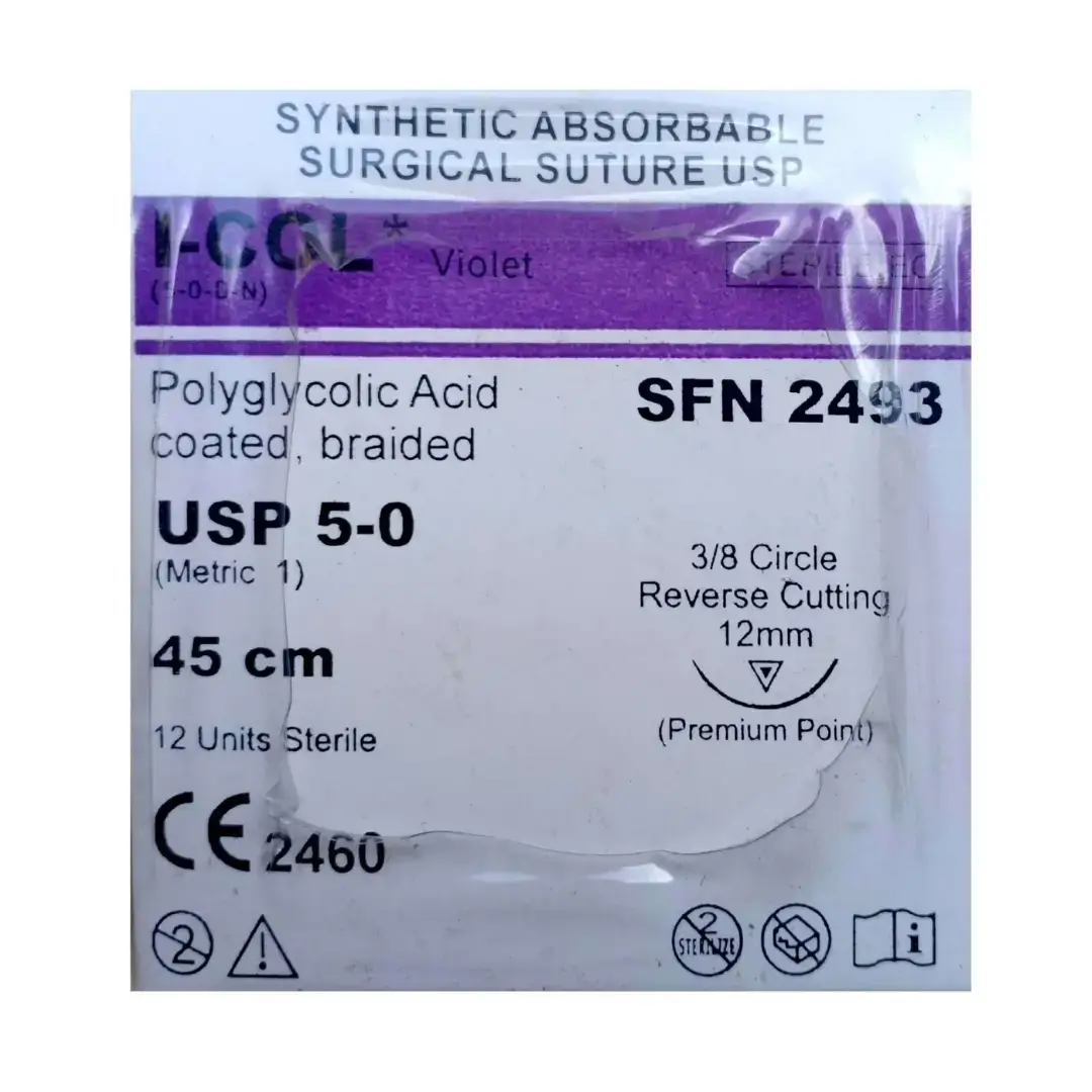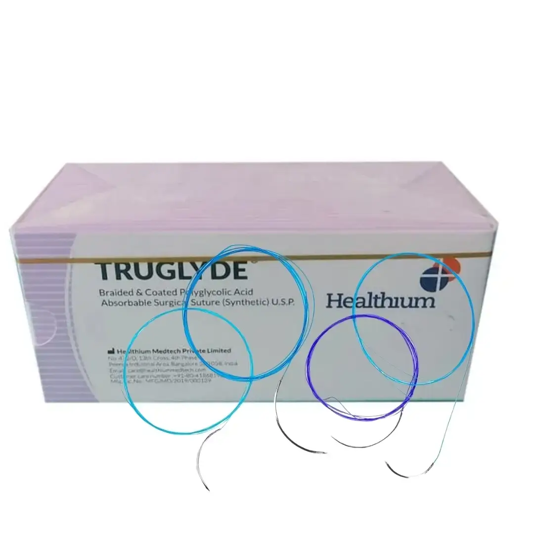 Healthium (Sutures India) Truglyde SFN 2493 is a sterile, synthetic absorbable surgical suture made from braided and coated polyglycolic acid. It is designed for soft tissue approximation across various surgical specialties.