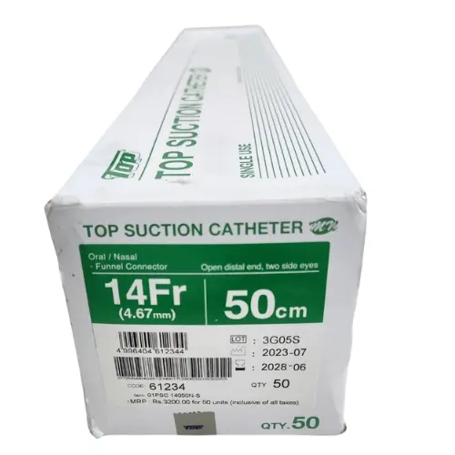 Ensure safe and effective airway management with the Top Suction Catheter 14FR (4.67mm) designed for both oral and nasal suctioning. This high-quality, medical-grade catheter features an open distal end and two side eyes for optimal suction performance, ensuring the removal of secretions efficiently. The funnel connector offers easy, secure attachment to suction devices, making it a reliable choice for healthcare professionals.